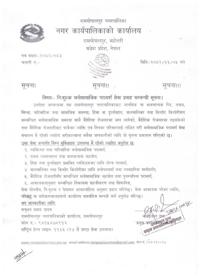 » निःशुल्क मनोसामाजिक परामर्शकर्ता सेवा सम्बन्धी सूचना !
