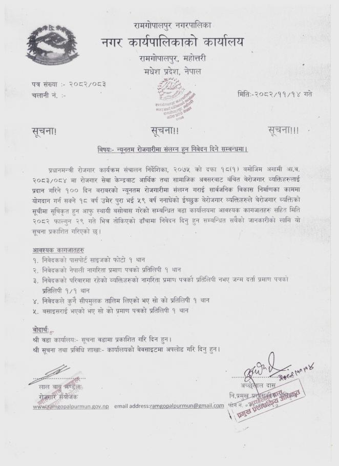 न्यूनतम रोजगारीमा संलग्न हुन निवेदन दिने सम्बन्धमा सूचना !