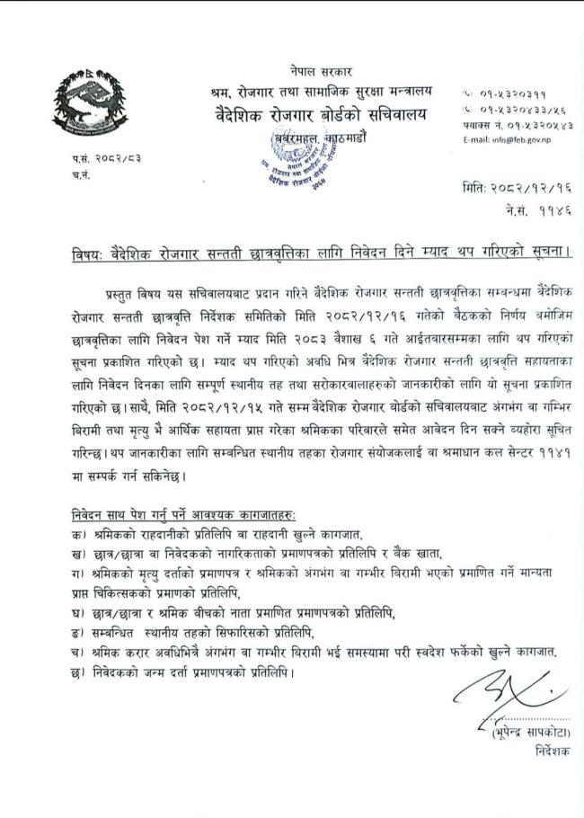 वैदेशिक रोजगार सन्तती छात्रवृत्तिका लागि निवेदन दिने म्याद थप गरिएको सूचना !