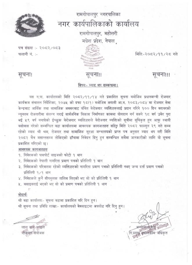 न्यूनतम रोजगारीमा संलग्न हुन निवेदन दिने सम्बन्धमा सूचना !