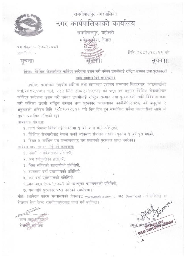 वैदेशिक रोजगारीबाट फर्किएर स्वदेशमा उद्यम गरी बसेका उद्यमीलाई राष्ट्रिय सम्मान तथा पुरस्कारको लागि आवेदन दिने सम्बन्धमा सूचना !